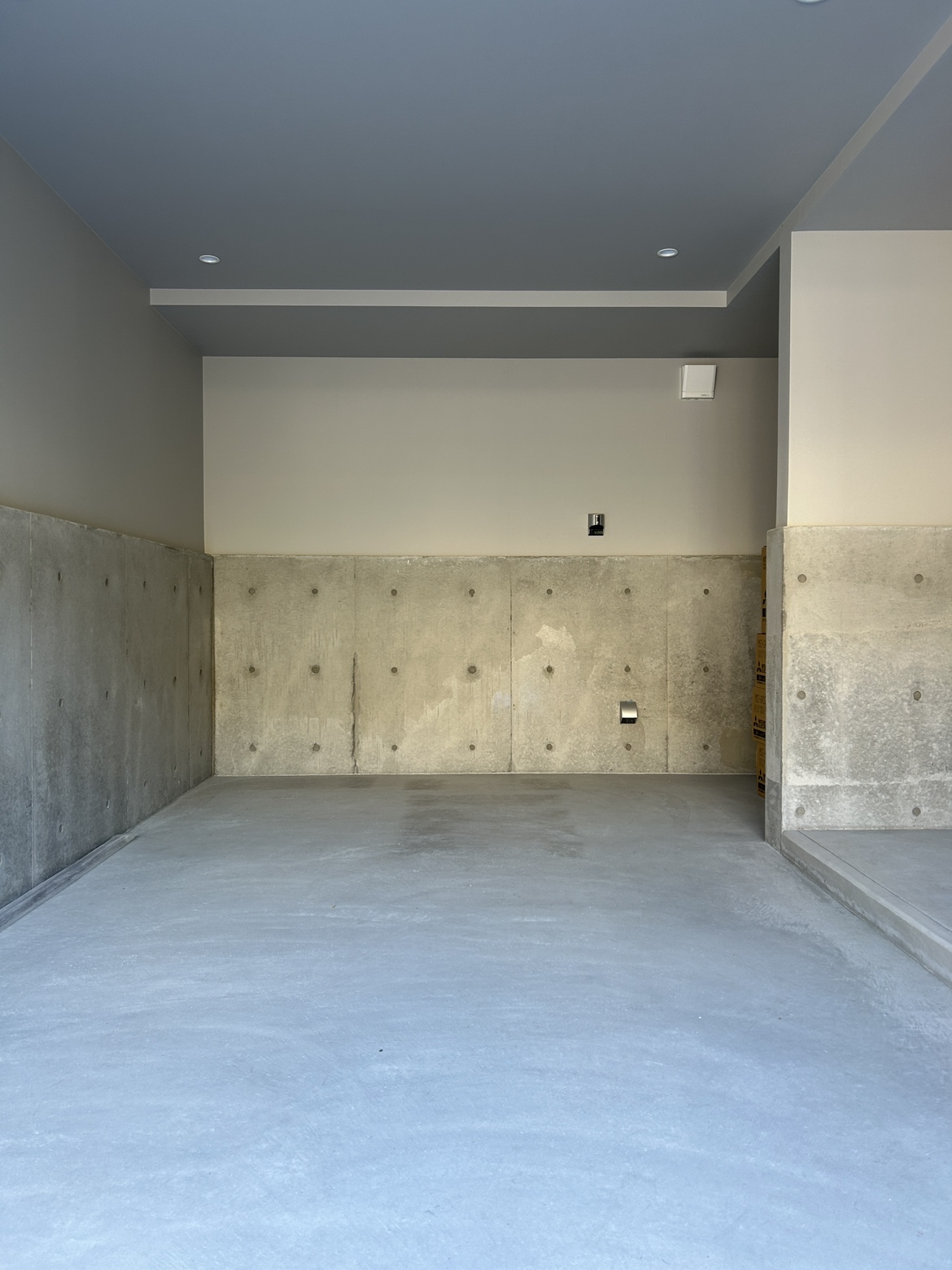 別府らしい傾斜のある敷地を活かし、半地下として設計されたビルトインガレージは洞窟のような籠れる空間に。