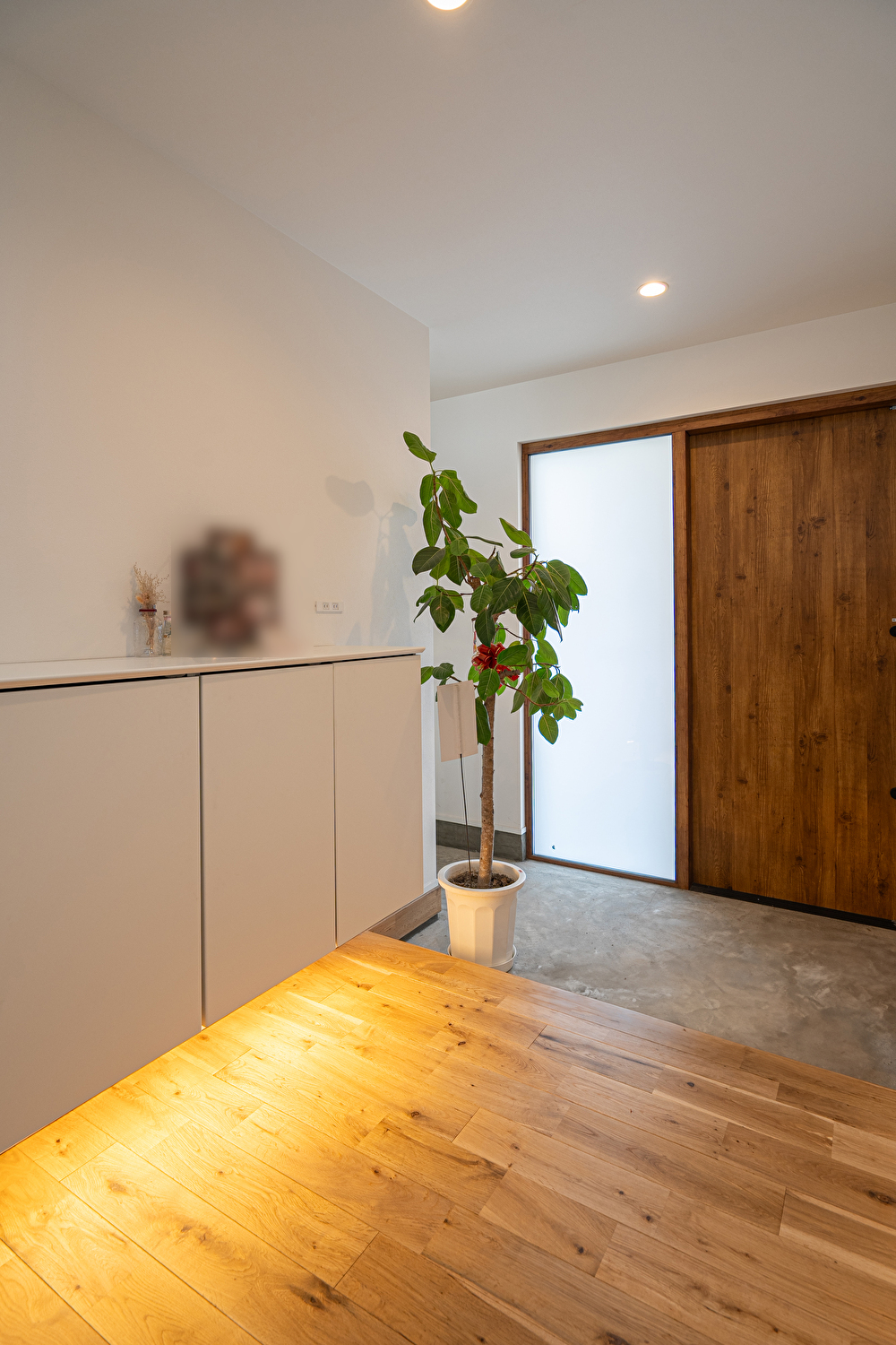 玄関ホールは高天井で、訪れた瞬間に空間の広がりを感じられる設計。