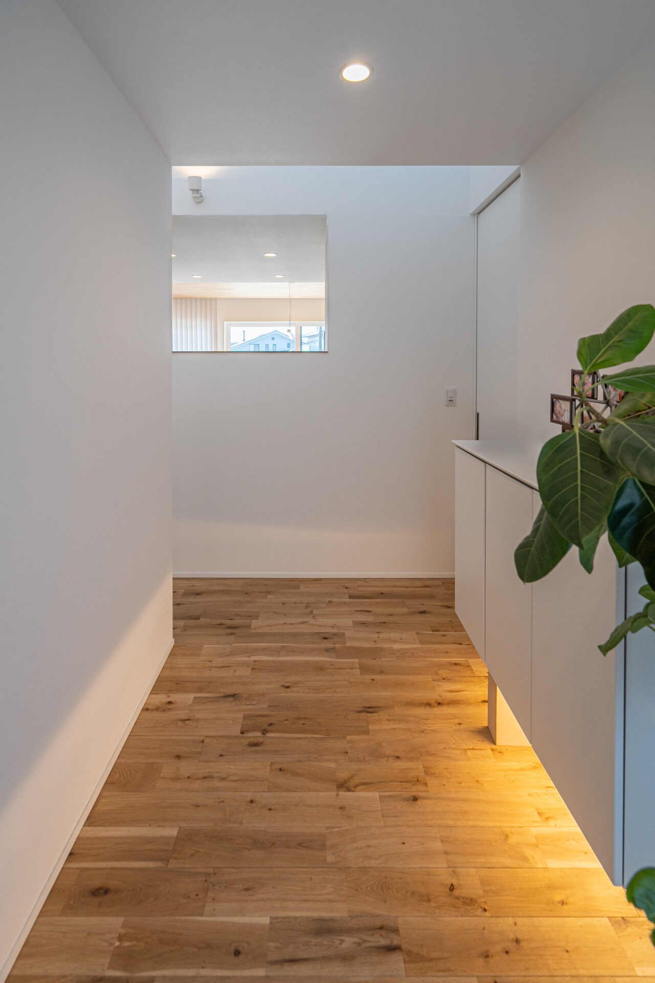 玄関ホールは高天井で、訪れた瞬間に空間の広がりを感じられる設計。