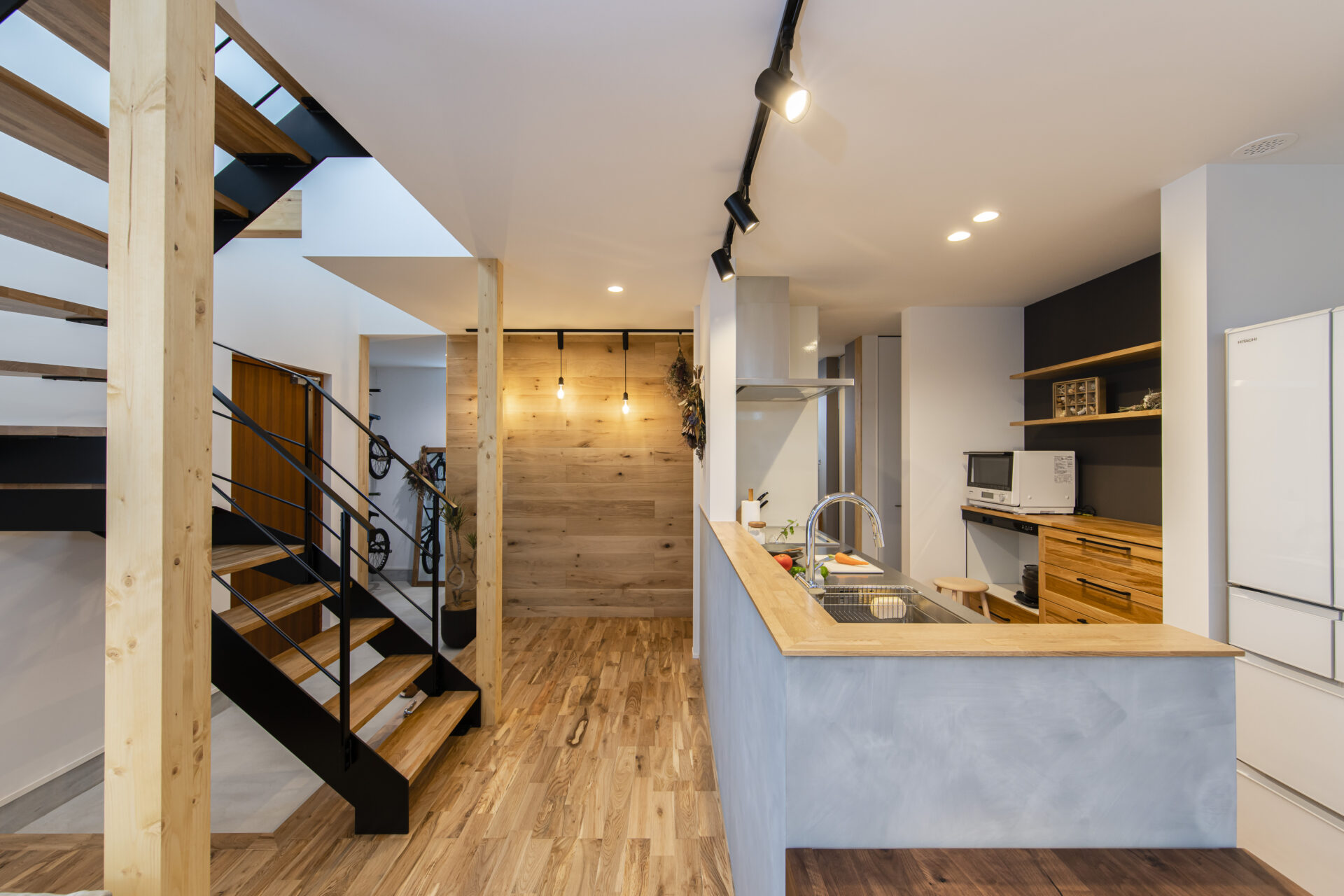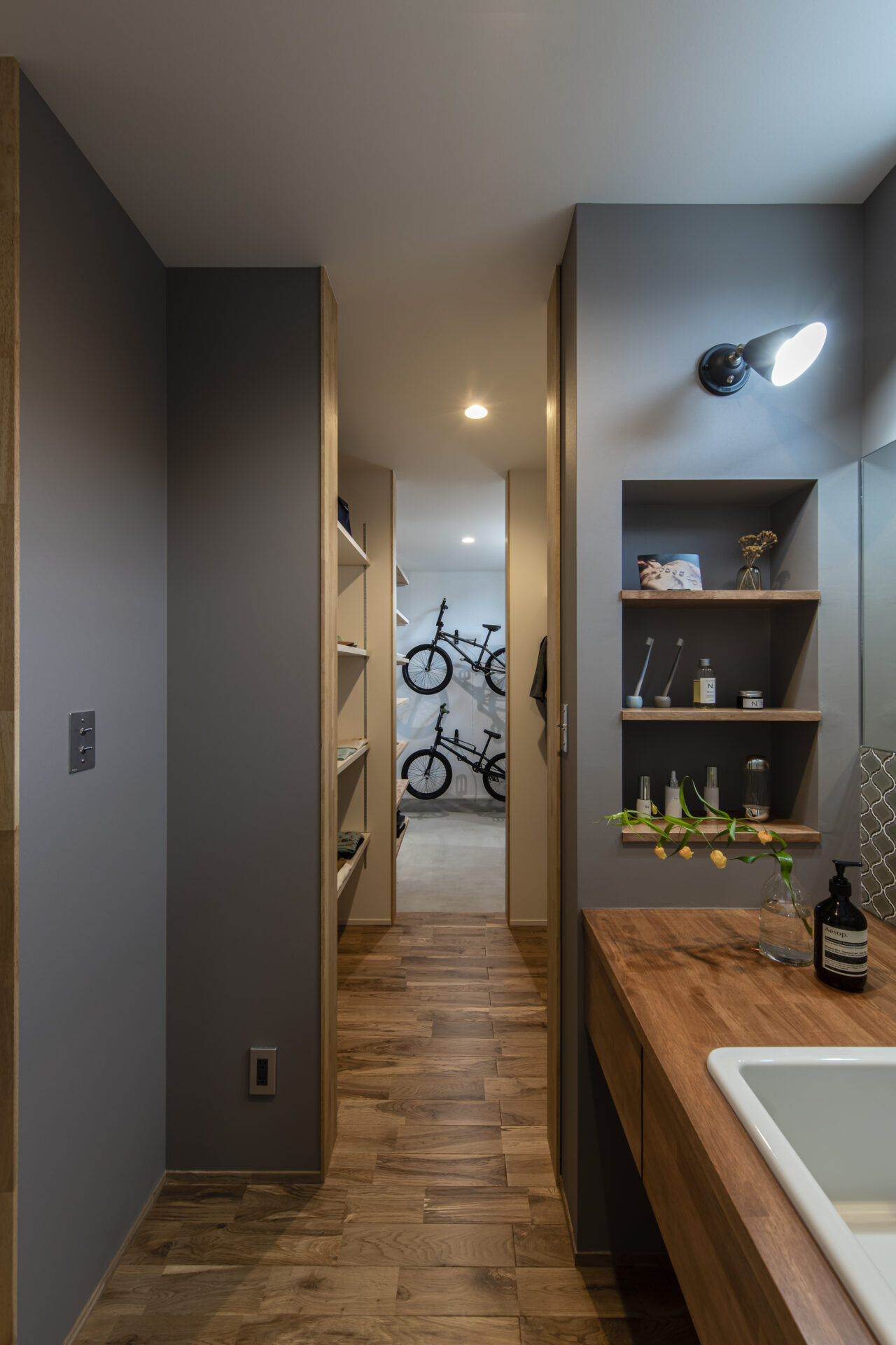 土間→洗面→キッチンへとまわれる便利な回遊動線で、家事の負担をぐっと軽減。