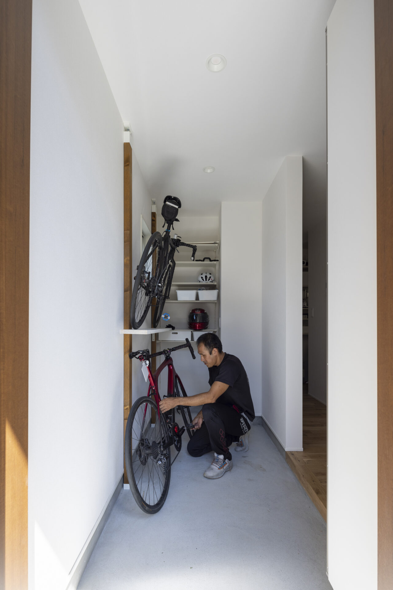 アウトドア用品を置くなど、幅広く活用できる土間を玄関と居住スペースの一部に採用。