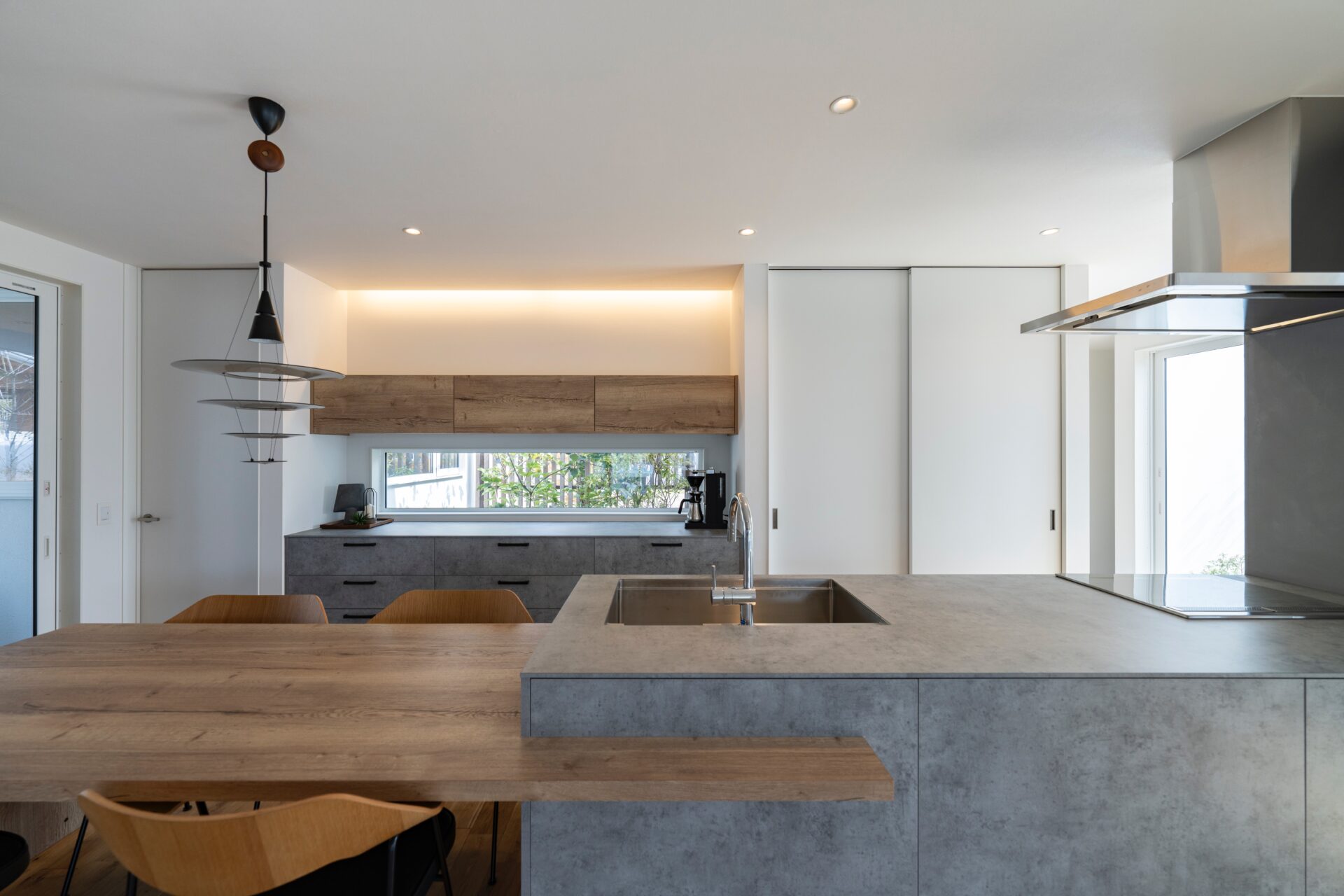 キッチンとダイニングが一体になった形状は、横に流れるような導線で楽に配膳・片付けを行えるようになります。