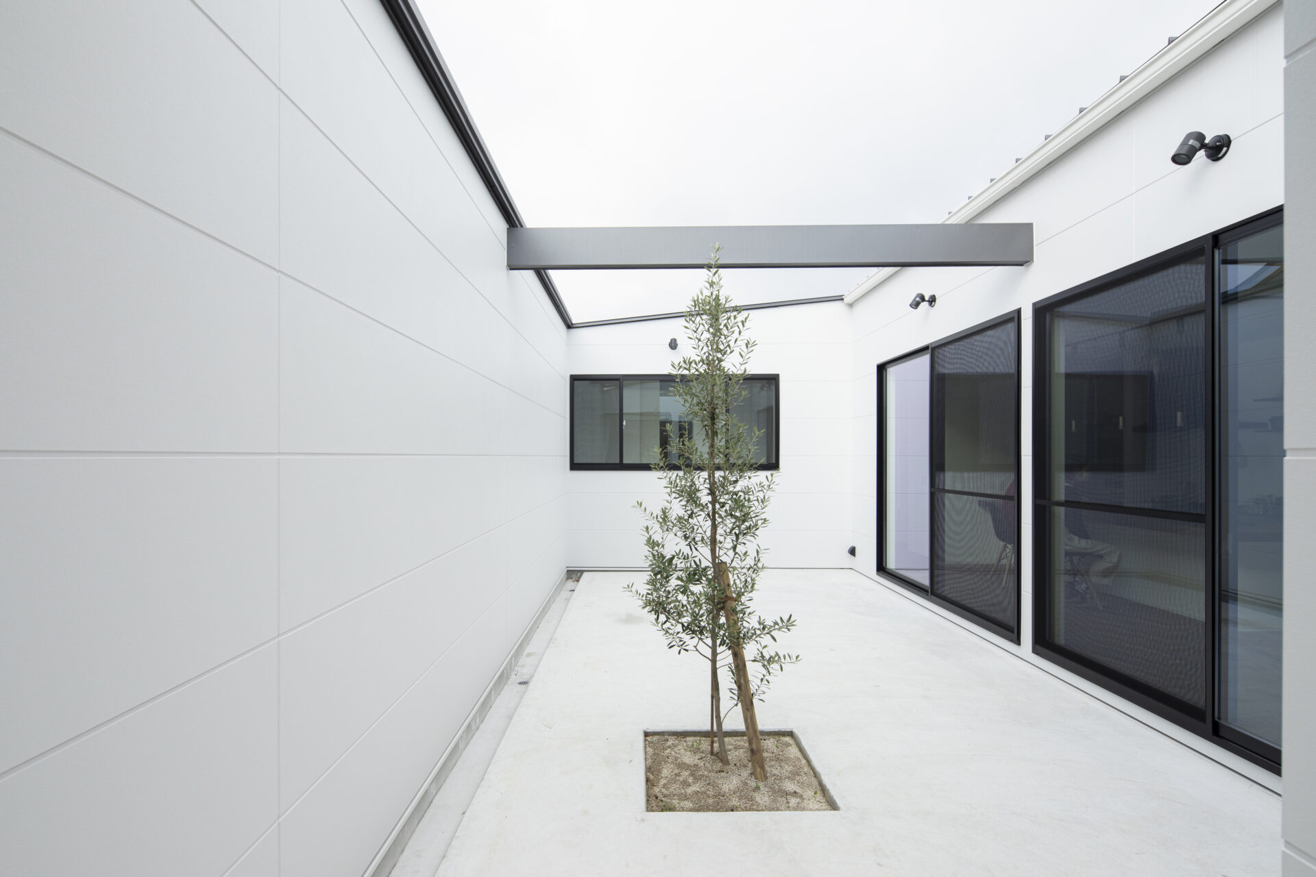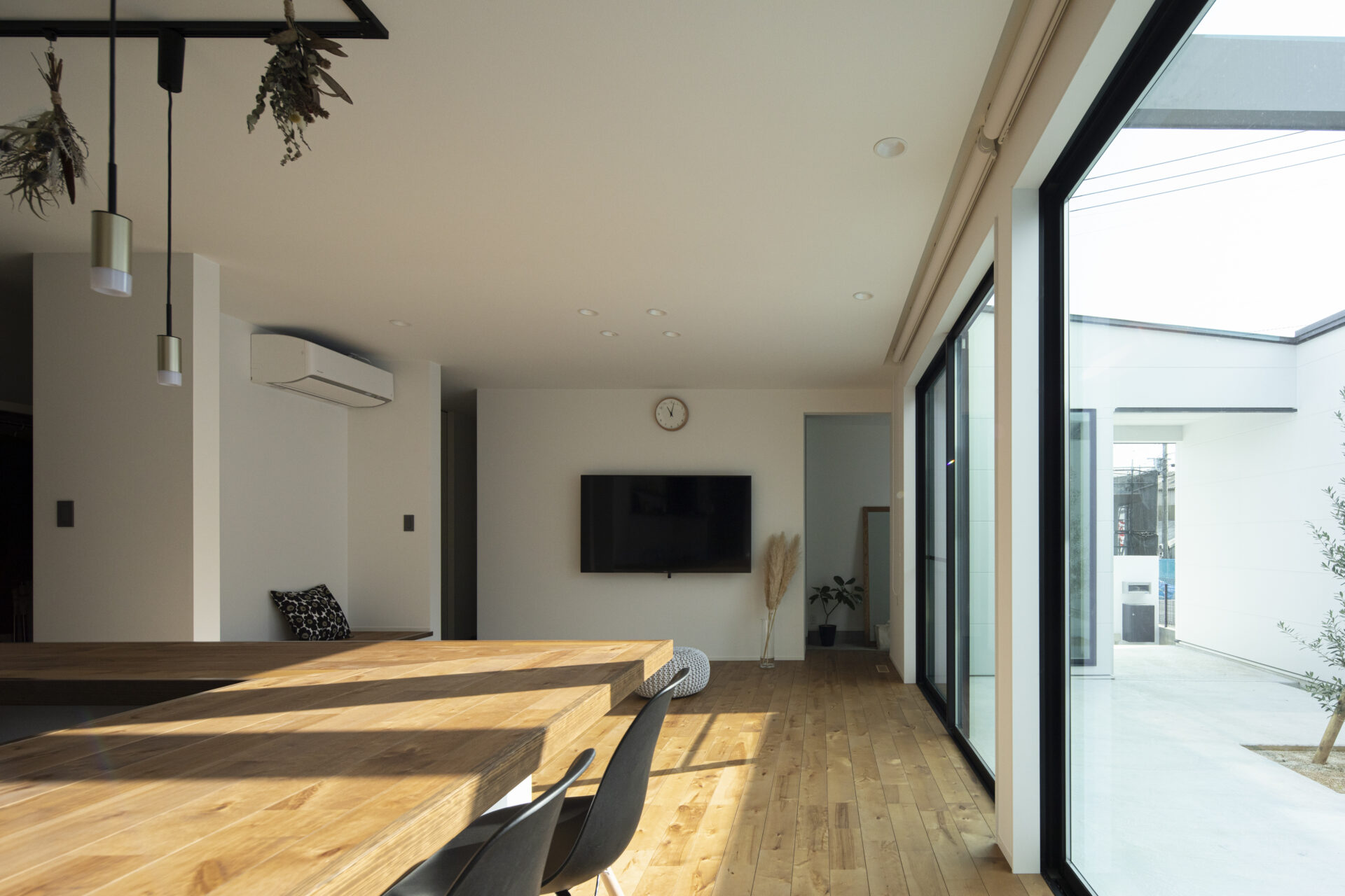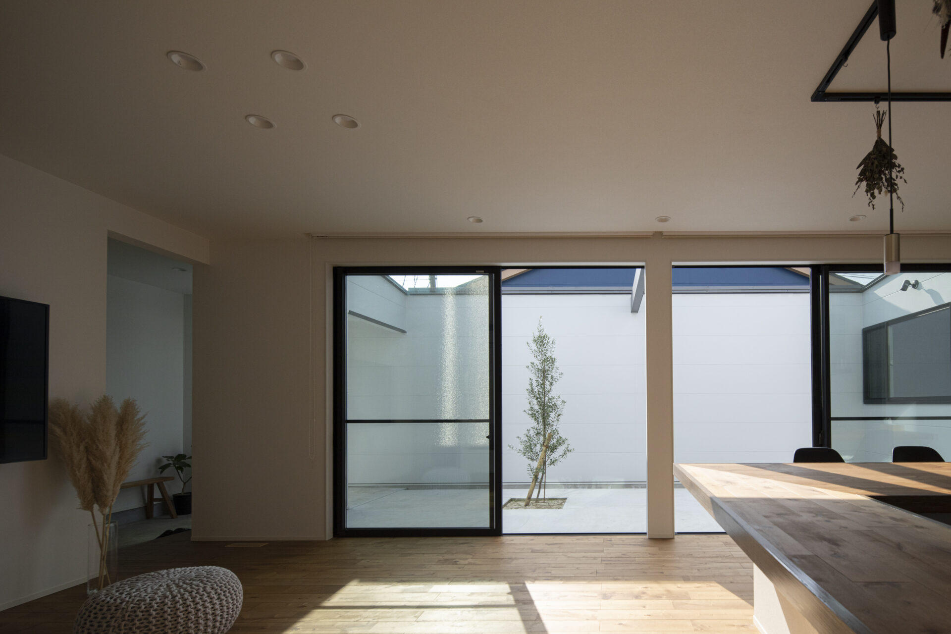 リビングに隣接する中庭には塀を設け、外からの視線を遮る“カーテンレス”の開放設計を実現。